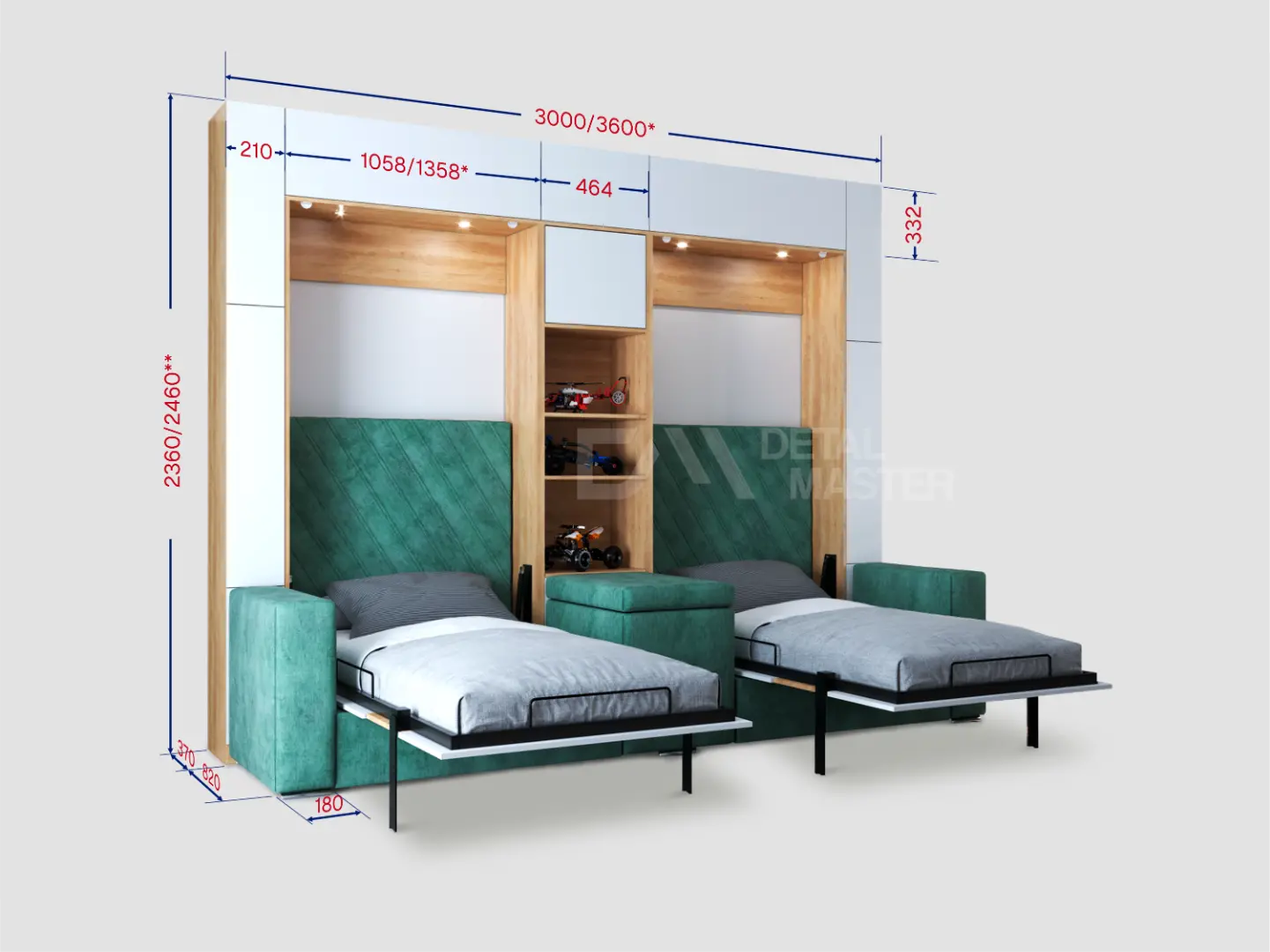 Дополнительные опции, такие как: освещение, зарядное устройство, розетки, мягкое изголовье, матрас, мягкий борт - не входят в стоимость шкаф-кровати "Twin 2.0". Вы всегда можете самостоятельно их добавить в опциях или написать менеджеру при оформлении заказа.